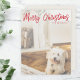Simple, stylish custom photo "Merry Christmas" flat holiday card with modern minimalist handwritten script typography in red and a simple warm gradient over a full photo background. The photo of your beloved pet and text can easily be personalised for a design as unique as your special furbaby! The image shown is for illustration purposes only to be replaced with your own photo. The placeholder image is of an adorable small dog sitting in front of a fireplace dressed with christmas foliage and silver birch logs. The pup is sitting on a herringbone parquet floor. #christmas #dog #puppy #holidaycard