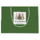 Minimalist watercolor christmas tree gift bag with playful leopard pattern in earthy green and gold. Personalise with your custom name for a stylish Christmas gift presentation.