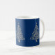 Three stylised, silver-gold Christmas trees made of stars and swirling lines on a dark, midnight-blue background makes a beautiful holiday mug.