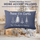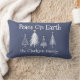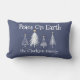 Modern Christmas with Family Name Accent Pillow designed with white Christmas trees with gold colored stars on a rich blue background. The text reads: Peace On Earth along with your Family Name. The reverse text reads: Merry Christmas. To personalize simply insert your name into our easy template, replacing the sample. Makes a great Christmas gift, or for your home holiday decor.