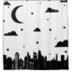 Modern cityscape skyline shower curtain with whimsical stars, clouds, and a crescent moon.