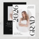 Announce the graduate's big achievement in style with this modern photo graduation announcement. The trendy design features "Class of 2025 Grad" in bold black lettering with subtle script accents with a solid white background. The graduate's vertical photo is displayed inside an oblong frame at the centre of the announcement. Personalise the front of the black and white graduation announcement with the graduate's name and school. The announcement reverses to display an additional photo displayed inside of a white square frame with your custom text shown below. The stylish graduation announcement is perfect for high school and college graduates.