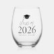 Modern graduation wine glass featuring a graduation cap near the top of the design with "Class of 2025" displayed in a black script and serif font. Personalise the custom wine glass with the graduate's name. This personalised stemless wine glass is the perfect gift for the special graduate(s) in your life and makes for an excellent graduation party favour!
