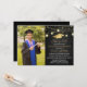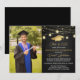 Modern Graduation Celebration invitations featuring a stylish black background, a photo of the graduate, lights, and gold script calligraphy text that is easy to personalise. Perfect for a backyard party.