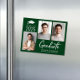 Modern Class of 2025 green graduation magnetic announcement card featuring 3 photos and "Graduate" in a bold contemporary white script. Add the grad's name, class year and school in simple white typography.