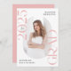 Announce the graduate's big achievement in style with this modern photo graduation announcement. The trendy design features "Class of 2025 Grad" in bold light pink lettering with subtle script accents with a solid white background. The graduate's vertical photo is displayed inside an oblong frame at the centre of the announcement. Personalise the front of the pink graduation announcement with the graduate's name and school. The announcement reverses to display an additional photo displayed inside of a white square frame with your custom text shown below. The stylish graduation announcement is perfect for high school and college graduates.