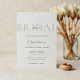This bridal shower invitation has a sophisticated and minimalist design with a soft, elegant feel. The background is a clean white, and the word "BRIDAL" is displayed in large, light grey uppercase letters across the top, creating a subtle yet stylish backdrop. The word "shower" is overlaid in a small, delicate script font. The text that follows is centred, with a mix of uppercase serif and cursive fonts, adding a graceful touch to the bride-to-be's name and event details. The overall layout is simple, airy, and refined, conveying a modern, classy aesthetic perfect for a bridal celebration.