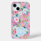 Customise this gorgeous modern colourful flower garden of flowers in pink, blue, purple, and yellow iPhone 15 case with your your initials in a modern CAP font in white on blue. It's so vibrant and happy!
