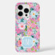 Customise this gorgeous modern colourful flower garden of flowers in pink, blue, purple and yellow iPhone 16 pro case with your your initials in a modern CAP font in white on blue. It's so vibrant and happy!