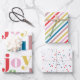 Add a splash of festive charm to your gift-giving with this joyful trio of holiday wrapping paper sheets: one features bold, multicolored typography that radiates cheer and celebration; another showcases vibrant, candy-striped lines for a classic yet playful look; and the third is sprinkled with adorable stars and hearts in a rainbow of hues, perfect for adding a sweet, whimsical touch to every present.