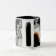 This black mug features an abstract, psychedelic spiral fractal art in black and white with yellow, orange, blue, and green accents.
