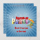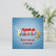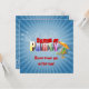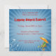Summer Party invitation: colourful 3D Text, decorated with floral ornaments, a beach lounger, a cocktail and flip-flops on a blue sunburst background.