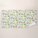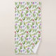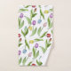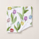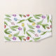 The product design features a pattern of colourful tulip flowers in purple, red, pink, blue, and yellow. This botanical illustration makes elegant modern and unique bath towels.