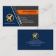 Design features a dark blue trapezium at the left wall which has your faux gold airplane logo with its business name. Beside it are the contact details, each housed to its respective buttons. Northwards to this, in an orange column lies your prestigious name and job title.