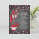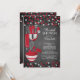 Modern stock the kitchen bridal shower invitation featuring a rolling pin, mixing bowl, spatula, pizza cutter, whisk, vegetable peeler and measuring spoons set on a contemporary chalkboard background with red & black polka dot confetti. Visit our shop to view this invitation in a variety of popular wedding shower invitations.