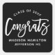Seal your graduation envelopes and party favour bags with these personalised graduation stickers! The design features "Congrats" displayed in a modern white script with a black background (or colour of your choice). Personalise the black and white congrats graduation stickers with the graduate's name, graduation year, and school name. This sticker is perfect for both high school and college graduations.