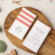 Modern and chic business card design in a unique vertical format features three wide coral stripes on a white background, with your name and business name or title in an attractive mix of lowercase serif and modern caps typefaces. Add your full contact information to the back in classic navy blue. Suitable for any occupation; example shown for interior design professions.