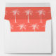 Customise this elegant design featuring modern script typography with your name and return address on the back flap. An artistic coral palm tree adorns the front while the inside of the envelope features a white palm tree pattern over a coral background. If you need help or matching items, please contact me.