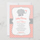 Stylish and sweet baby shower invitation features an adorable newborn baby elephant calf with heart shaped splashes. The design combines a pattern of classic diagonal stripes with playful polka dots and includes a colour scheme of coral pink, peach, grey and white.