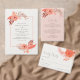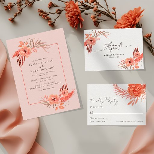 The Modern Coral Orange Floral Terracotta Wedding Invitation features a warm and elegant color palette inspired by nature. Soft coral and orange florals blend beautifully with terracotta tones, creating a modern rustic look. The floral artwork feels light and artistic, adding charm without overpowering the design.
