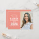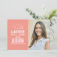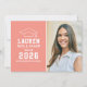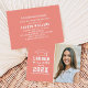 Celebrate your senior with a modern coral graduation party invitation featuring a clean cap icon, bold varsity-style name, and Class of 2026 layout paired with a large photo. Personalise the name, school, year, party details, and RSVP. Backside includes the “Lets Celebrate the Graduate” headline with coordinating open house details.