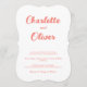 The Modern Coral Pink White Wedding Invitation features a clean white background with soft coral pink script typography. The invitation is designed in a decorative modern shape, adding a refined and elegant touch while keeping the overall look clean and minimalist.