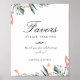 Elegant and modern painted tropical island leaves in silver green and coral pink, personalised wedding "Favours" sign poster. Modern typography design style mixes script with bold type.