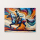 This modern abstract design features a cowboy riding his horse in a swirl of colours.