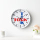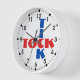 Here's a cool red and blue pattern clock design for any home or office wall. This lightweight acrylic wall clock face has a contemporary designed blue word "Tick" and the red word "Tock" in a crossword puzzle style typography over a white background. The design includes an outer ring of black elements and an inner ring of black numbers.