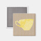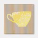 Charming modern design features light brown striped background with a sunny yellow coffee cup in the centre.