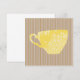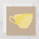 Charming modern design features light brown striped background with a sunny yellow coffee cup in the centre.