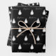 Modern gift wrap set features three coordinating wrapping paper sheets: white fir tree with name, white script "Merry Christmas" text, and white fir tree pattern on a black background. You can easily change the white background color. Matching items available in our store.