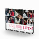 Create your own family photo block featuring a 5 photo collage, the words "love you lots" in a pink/red gradient font, your names, and the year.