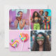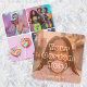 Create a stylish personalized greetings card using five of your favorite photos. It's a fun way to creatively display your pictures! The front of the card features a semi-opaque photo over a colored background, with trendy typography you can customize with your own text or slang. You can adjust the photo's opacity and the background color with the design tool. The back of the card showcases four photos in a simple grid with rounded squares. This modern, retro style is perfect for kids, teenagers, friends and family. It's an adaptable template, ideal for Christmas, holidays, birthdays, and other special occasions. Colors: white text, orange background. Available as a printed card or a digital download.