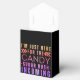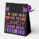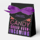 Fun and modern treat favour box for Halloween. Graphic says "I'm just here for the candy, sugar rush incoming" in shades of orange, pink, and purple. This favour box can be personalised on the front flap.