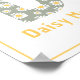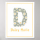Cute print for nursery or kid's room features monogram letter D in a fun white daisies on grey background print with customisable sunny yellow text and a thin border frame.