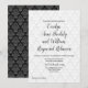 Stylish modern wedding invitation done in a white on white damask pattern, on the front and a black on black damask pattern, on the backside. A combination of script calligraphy and regular fonts make for a unique stylish look. Personalise all the custom text fields for your wedding. Matching products are available.