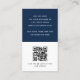 White and dark blue or custom colour, modern, professional business card design with template fields for name, company name/title, photo, QR code and contact information. Change background colour, move and resize elements with the customisation tool.