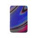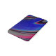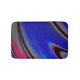 This abstract bath mat features a swirly fractal design in dark blue, magenta, black, and grey.
