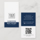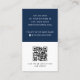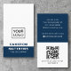 White and dark blue or custom colour, modern, professional business card design with template fields for name, company name/title, logo (photo or other graphic), QR code and contact information including social media icons. Change background colour, move and resize elements with the customisation tool.