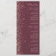 The left-hand edge of this elegant modern wedding program features a rose gold faux glitter design. The customisable text combines rose pink handwriting, copperplate and italic fonts on a dark burgundy background.