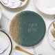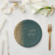 The left-hand edge of these elegant modern wedding paper plates features a gold faux glitter design. Personalise them with the names of the bride and groom in pale gold-coloured handwriting script over a large ampersand on a dark green background, with the wedding date below.