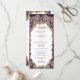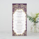 This wedding program card features a striking dark purple background accented with elegant gold damask details for a luxurious and modern look. The front page highlights the couple’s names inside a golden-edged medallion, while the back page presents the full wedding service details framed with decorative flourishes. The rich dark purple tone paired with shimmering gold creates a sophisticated design, perfect for formal ceremonies and keepsake-worthy wedding stationery.