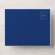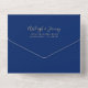 The left-hand edge of this elegant modern all-in-one wedding invitation and RSVP features a gold faux glitter border. The customisable text combines gold-coloured whimsical handwriting, copperplate and italic fonts on a dark royal blue background. The return address appears on the outside flap and the reverse side of the detachable RSVP card in gold-coloured text on solid dark royal blue.