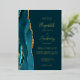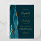 The left-hand edge of this elegant modern wedding invitation features a teal blue watercolor agate border trimmed with faux gold glitter. The customisable text combines handwriting, copperplate and italic fonts in real gold foil on a dark teal background. The reverse side features a matching teal and gold agate design.