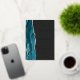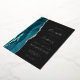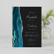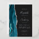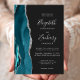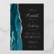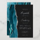 The left-hand edge of this elegant modern wedding invitation features a teal watercolor agate border trimmed with faux silver glitter. The customizable text combines real silver foil handwriting, copperplate and italic fonts on a dark off-black background. The reverse side features a matching teal and silver agate design.
