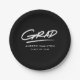 Modern graduation paper plates featuring "Grad" displayed in white handwritten lettering with a dashed underline on a black background. Personalise the black and white graduation paper plates by adding the graduate's name and graduation year. The personalised graduation paper plates are perfect for both high school and college graduation parties!