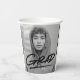 Modern graduation paper cups featuring the graduate's photo with "Grad" displayed in black, handwritten lettering with a dash below. Personalise the photo graduation paper cups by adding the graduate's name and graduation year. The design repeats on the back. The personalised graduation paper cups are perfect for both high school and college graduation parties!