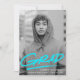 Modern graduation announcement featuring the graduate's vertical photo with "Grad" in bright turquoise handwritten lettering with a dash below. Personalize the trendy photo graduation announcement by adding the graduate's name, school name, and graduation year. The announcement reverses to display a pattern of turquoise and white dashed brushstrokes.