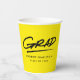 Modern graduation paper cups featuring "Grad" displayed in black, handwritten lettering with a dashed underline on a yellow background (or colour of your choice). Personalise the yellow graduation paper cups by adding the graduate's name and graduation year. The design repeats on the back. The personalised graduation paper cups are perfect for both high school and college graduation parties!